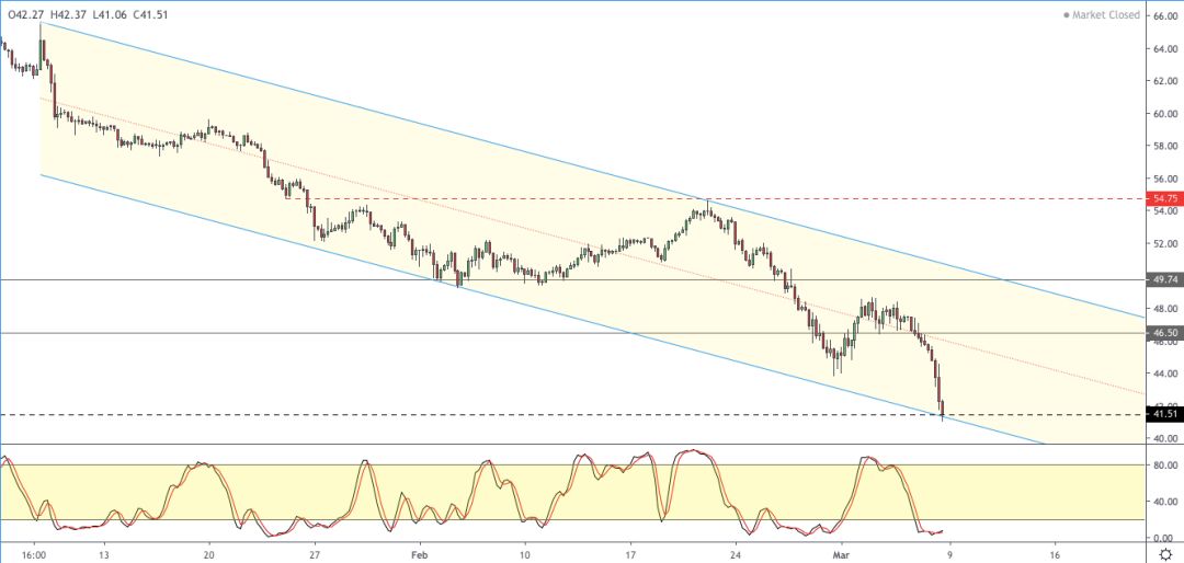 WTI原油价格上周五下跌超过9%,价格触及三年低点41.06。这与41.50的多年期支撑位不谋而合。如果这一位置保持下去,我们可以看到一些整合正在发生。这种整合将很可能保持在41.50和46.50。注意任何在更高位置形成低位的初始迹象,可能预示着反弹。